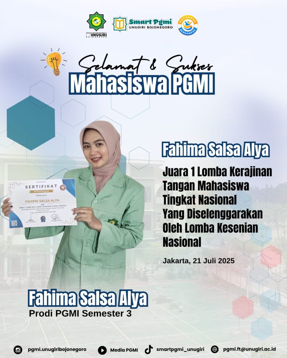 November 20, 2025Bojonegoro, 21 Juli 2025 – Universitas Nahdlatul Ulama Sunan Giri (UNUGIRI) Bojonegoro kembali menorehkan prestasi di tingkat nasional. Fahima Salsa Alya, mahasiswi semester 3 Program Studi Pendidikan Guru Madrasah Ibtidaiyah (PGMI), berhasil meraih Juara 1 Lomba Kerajinan Tangan Mahasiswa Tingkat Nasional yang diselenggarakan oleh Lomba Kesenian Nasional di Jakarta.