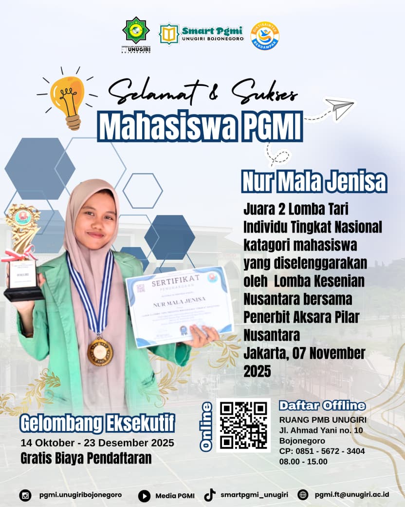 Prestasi ini menjadi bukti nyata bahwa mahasiswa PGMI UNUGIRI memiliki potensi dan kemampuan yang luas, tidak hanya unggul di bidang pendidikan, tetapi juga berprestasi di ranah seni dan budaya. Melalui ketekunan berlatih, konsistensi, serta semangat pantang menyerah, Nur Mala berhasil menunjukkan bahwa seni merupakan bagian penting dari pendidikan karakter dan ekspresi diri mahasiswa.