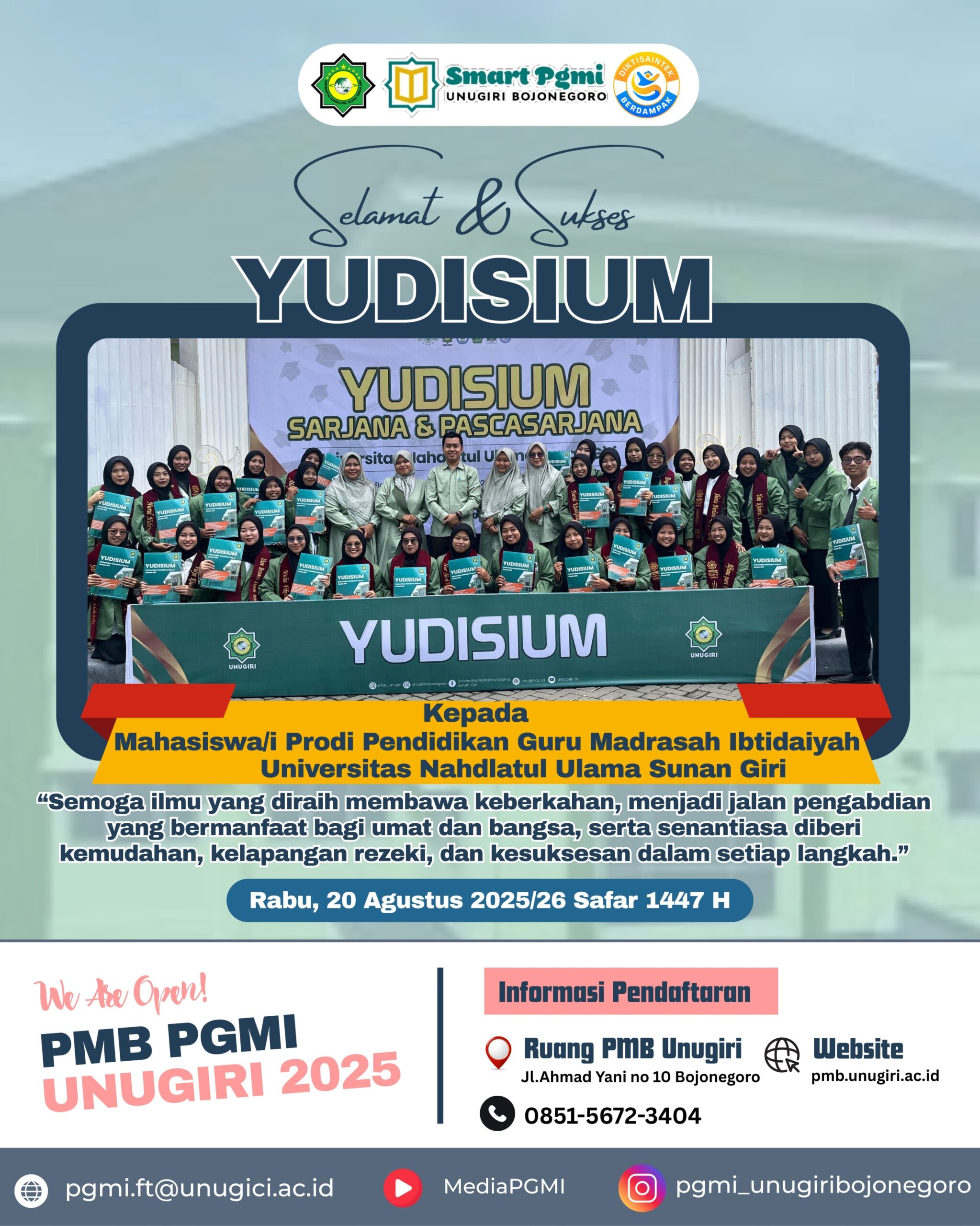 September 23, 2025Bojonegoro – Program Studi Pendidikan Guru Madrasah Ibtidaiyah (PGMI) Universitas Nahdlatul Ulama Sunan Giri (UNUGIRI) kembali menorehkan capaian penting melalui pelaksanaan Yudisium Sarjana & Pascasarjana yang digelar pada Rabu, 20 Agustus 2025/26 Safar 1447 H. Dalam momentum sakral ini, sebanyak 50 mahasiswa/i PGMI UNUGIRI dinyatakan lulus dan resmi menyandang gelar Sarjana Pendidikan (S.Pd.).